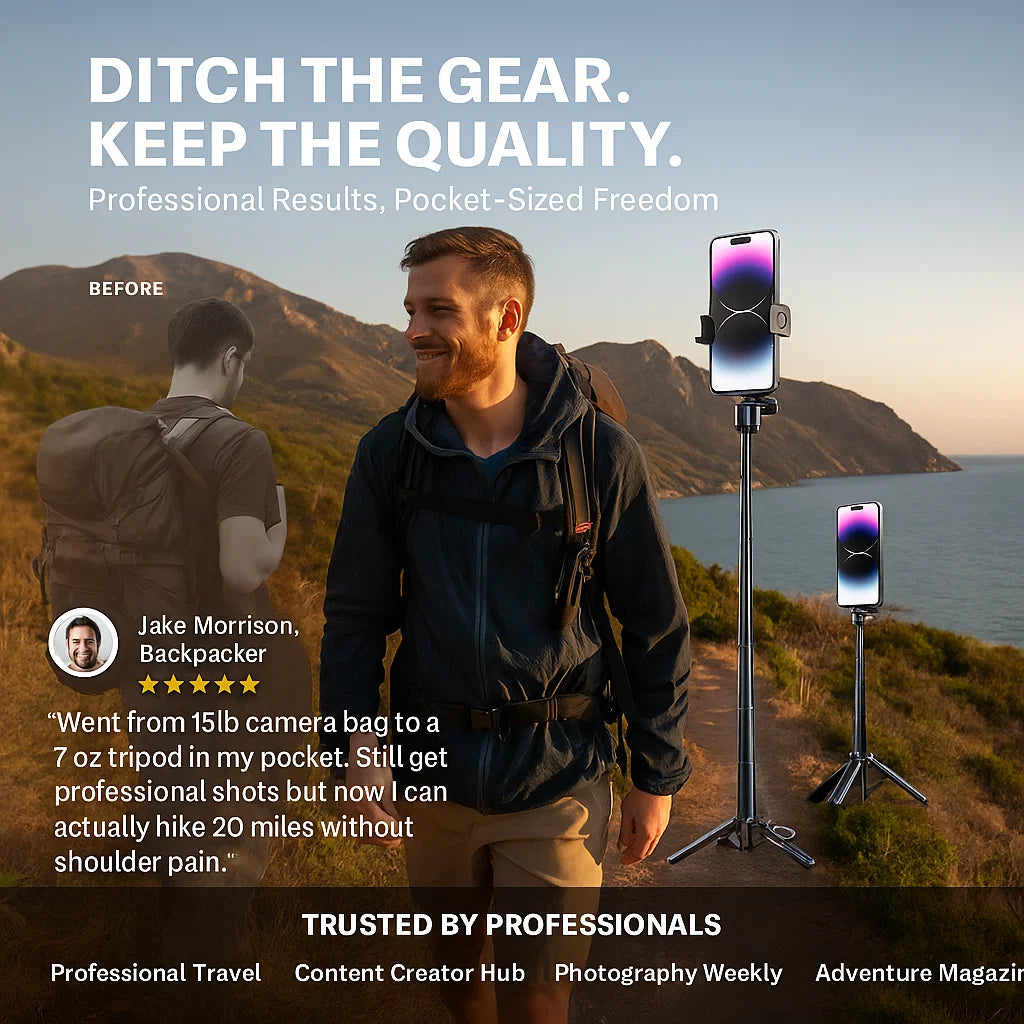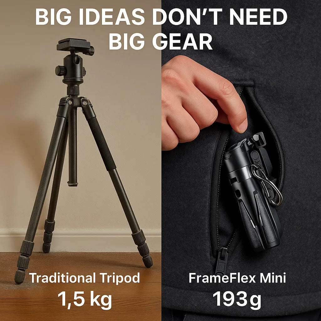 The Lumoro™ FrameFlex Mini slips easily into any carry-on, backpack, or jacket pocket — always ready when creativity strikes. Seamlessly switch between grip and tripod mode and start shooting, no matter where the road takes you.