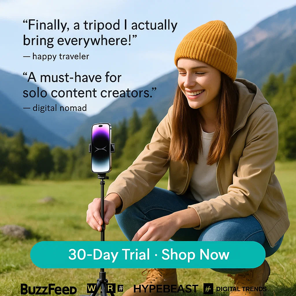 - 3-in-1 Tripod System – Combines a phone tripod, selfie stick, and handheld grip into one ultra-compact design. Perfect for stable shots, selfies, and on-the-go filming.