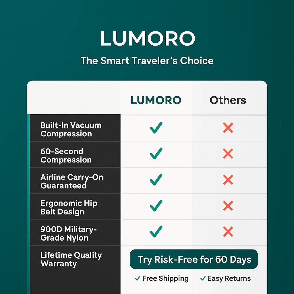 Lumoro™ Vacuum Travel Backpack. Whether you're flying frequently, weekend exploring, digital nomading, or taking multi-climate trips, this intelligent backpack offers built-in compression, airline compliance, and ergonomic comfort.