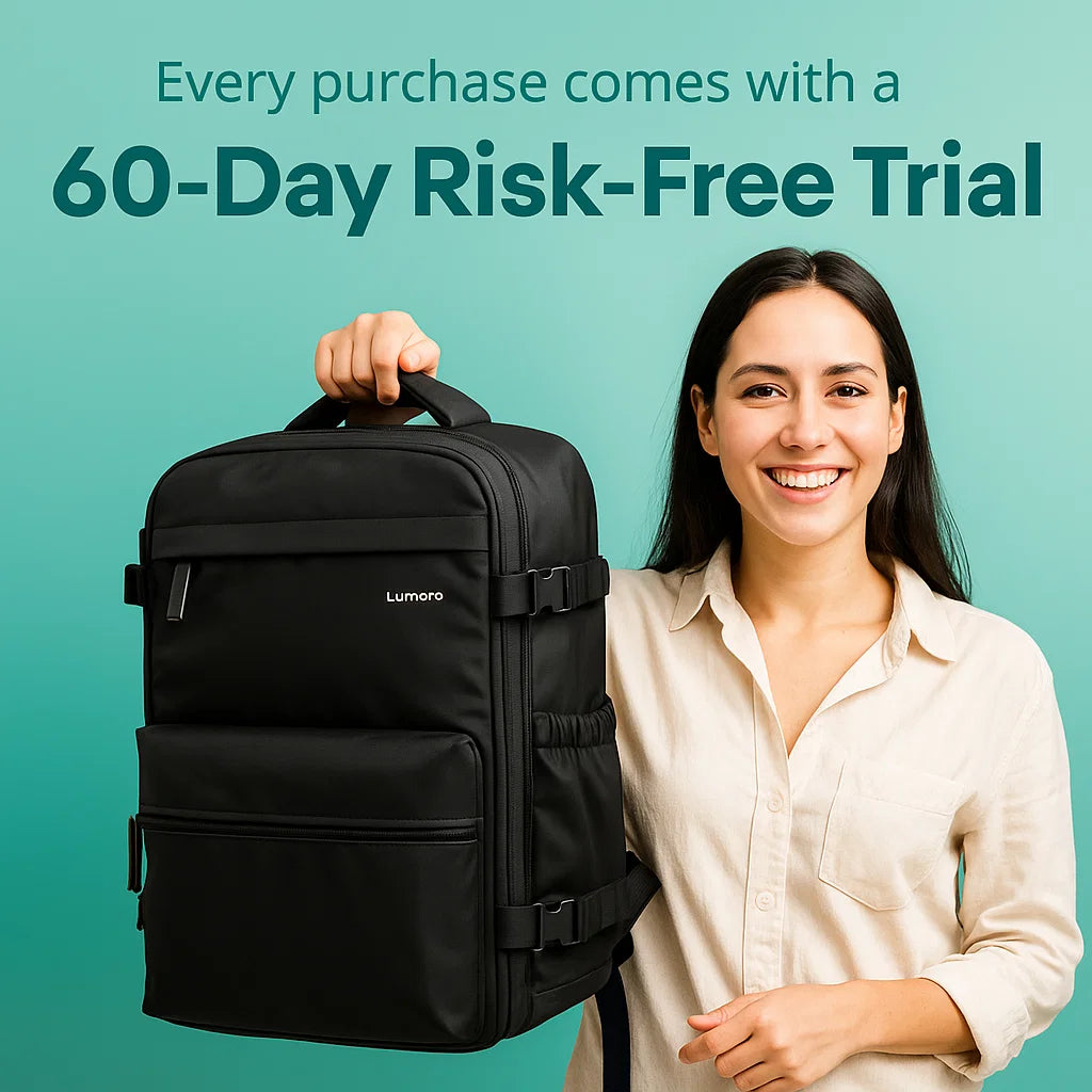 At Lumoro, we're confident you'll love stress-free travel. That's why we offer a 60-day airport-tested trial—experience the unmatched confidence of walking past every gate agent, and if you're not completely satisfied, return it hassle-free. Travel stress-free with Lumoro, where your peace of mind is guaranteed.